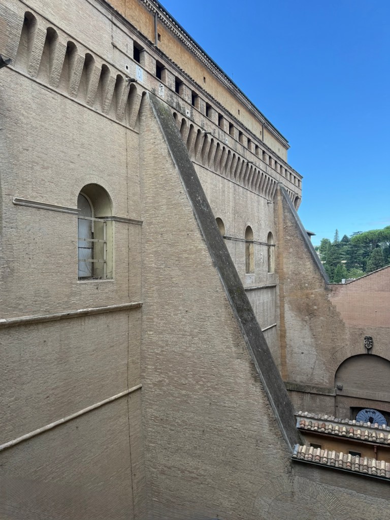 The Sistine Chapel is, of course, a highlight. Here is depicted an outside wall of this huge Chapel where Popes are chosen behind closed doors. The second photo shows where the temporary chimney is erected during Papal Elections – just below the black lightning rod.
