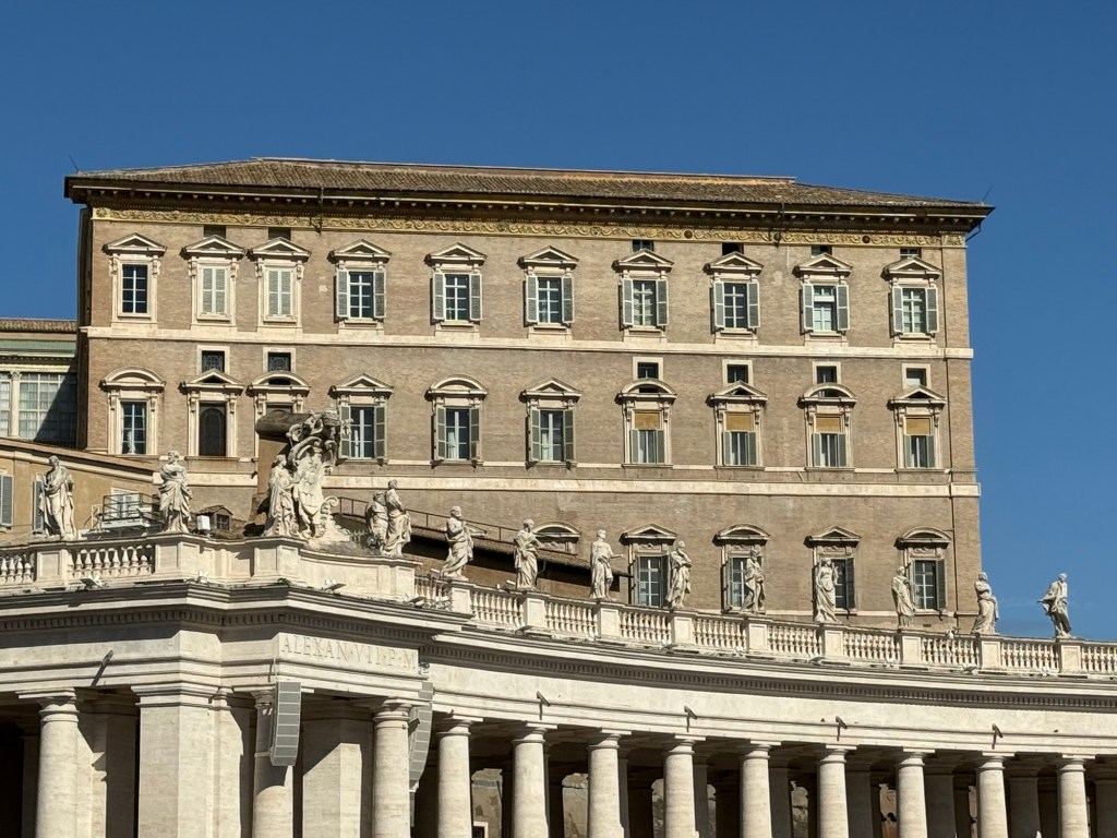 The Pope’s Official residence is depicted below. The window on the right, top floor, is the Pope’s bedroom and on its left is the Pope’s Office where he often greets visitors and offers them tea or coffee and perhaps a chocolate biscuit, if you’re lucky.