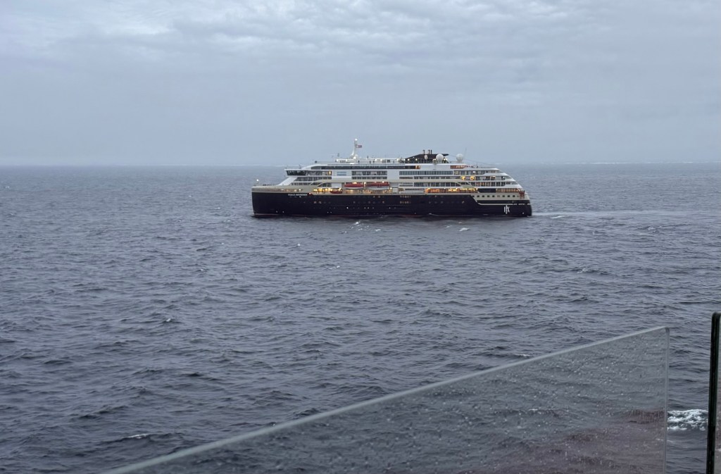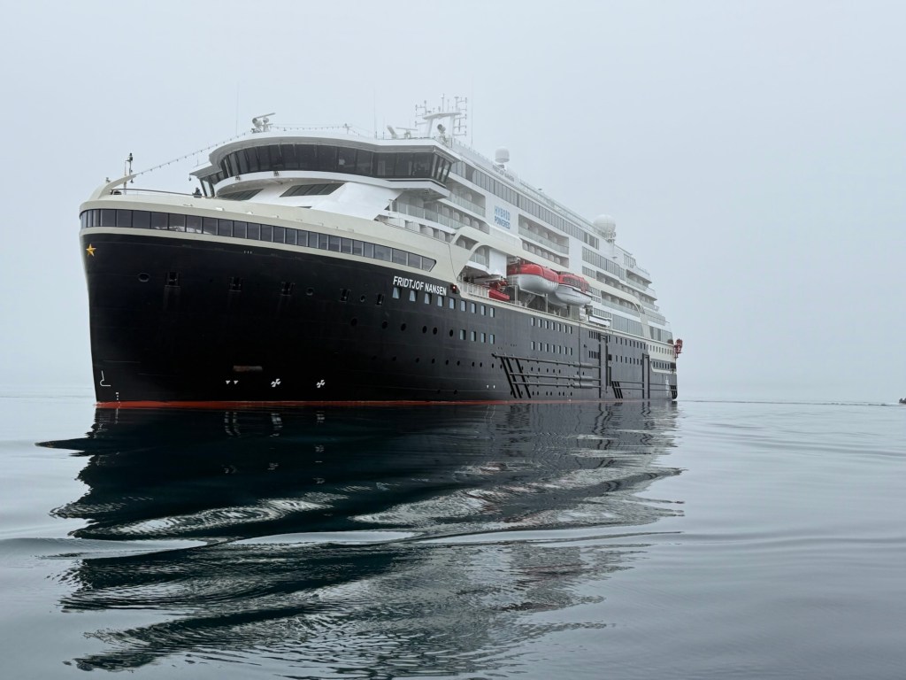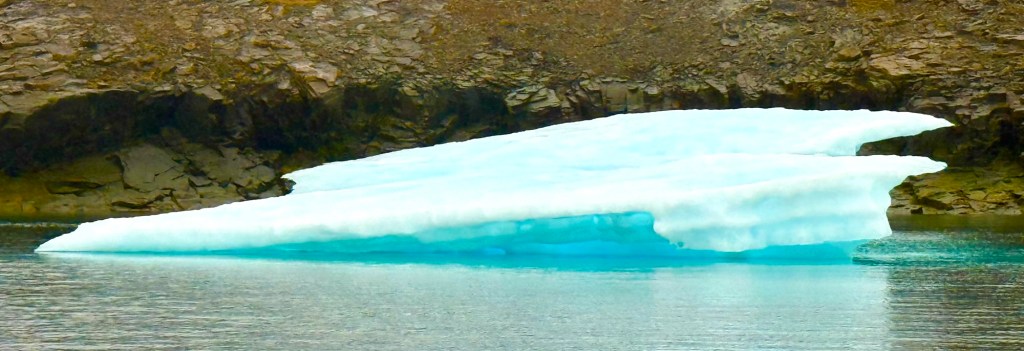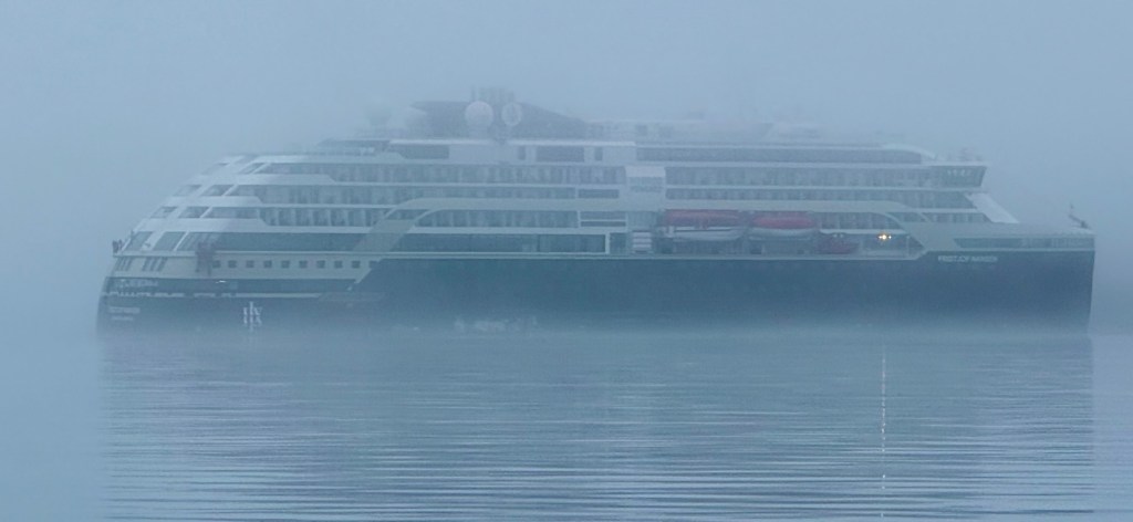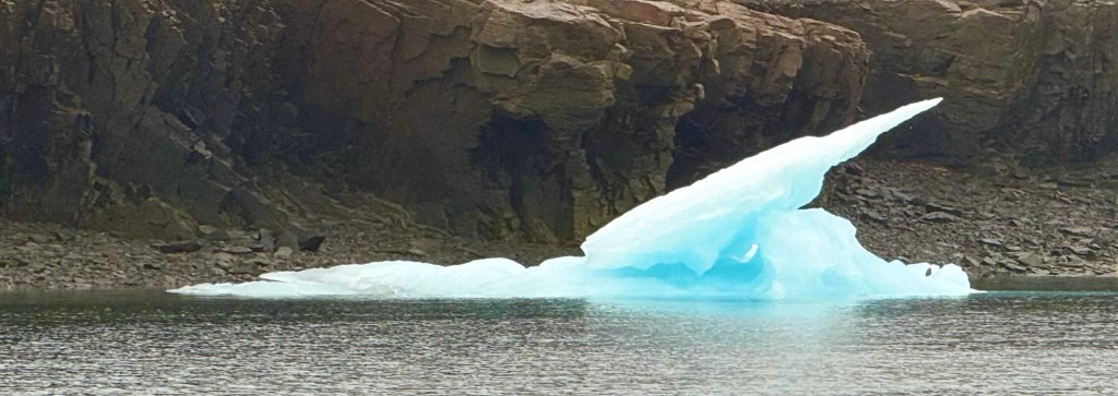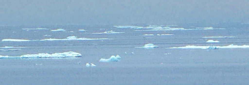 While cruising in Maxwell Bay this morning, a polar bear was spotted a few hundred yards up from the shore but a good distance from our ship. Fortunately, another guest had a super lens and shared his photo; I don’t know his name but thank you sir! Since then several other polar bears have been spotted.