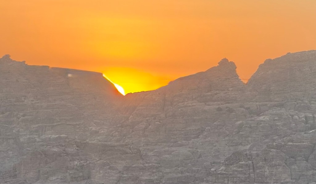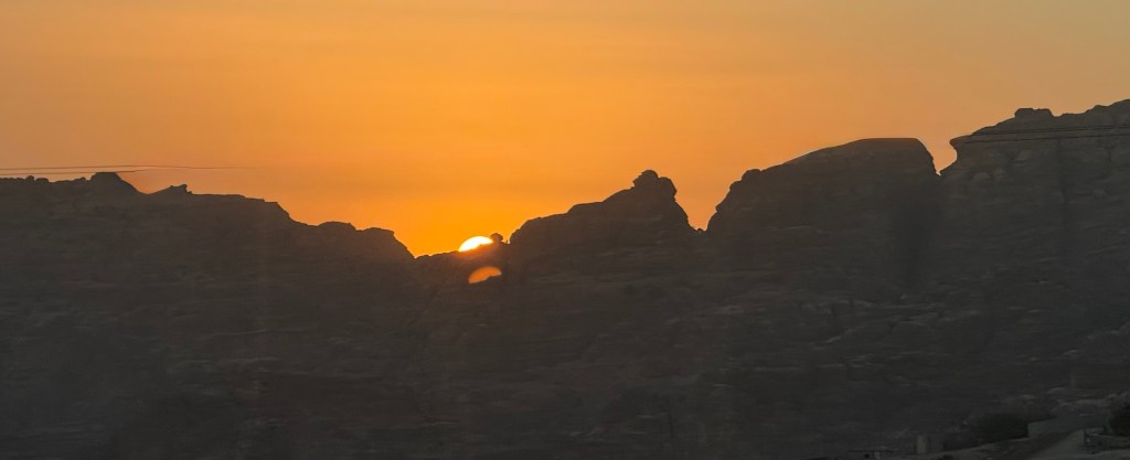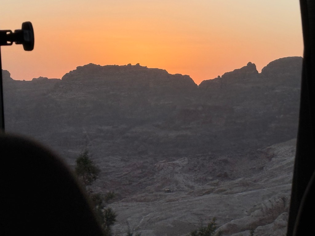 As we made our final approach to Petra, the sun set behind the mountains, casting a warm glow.