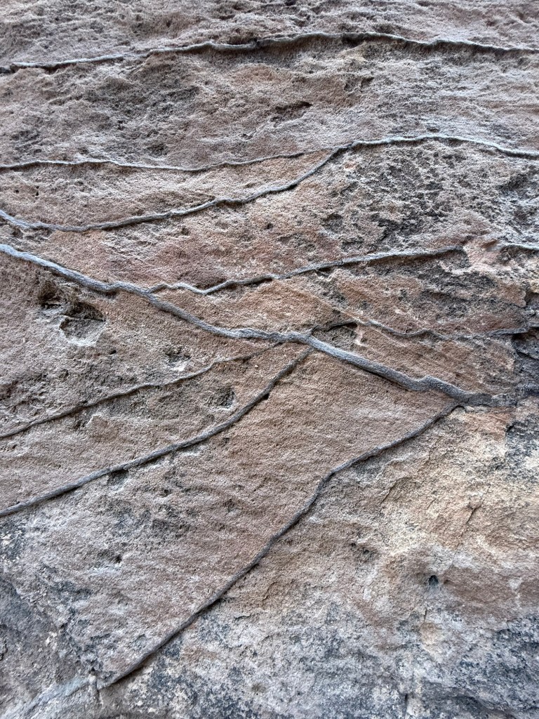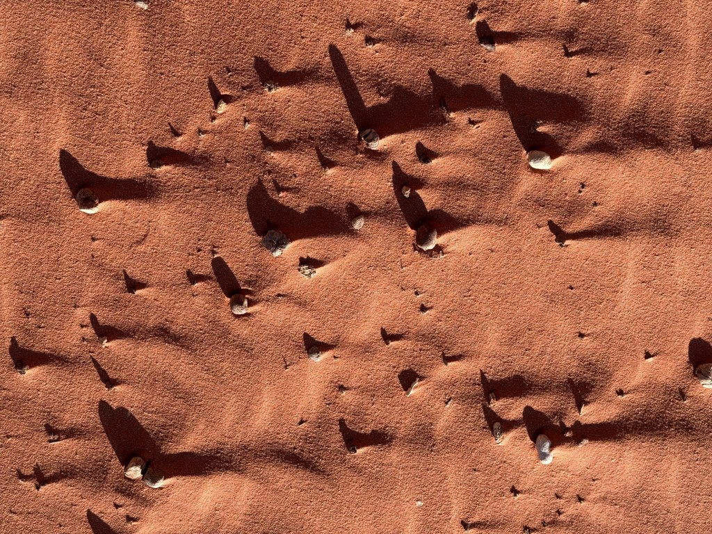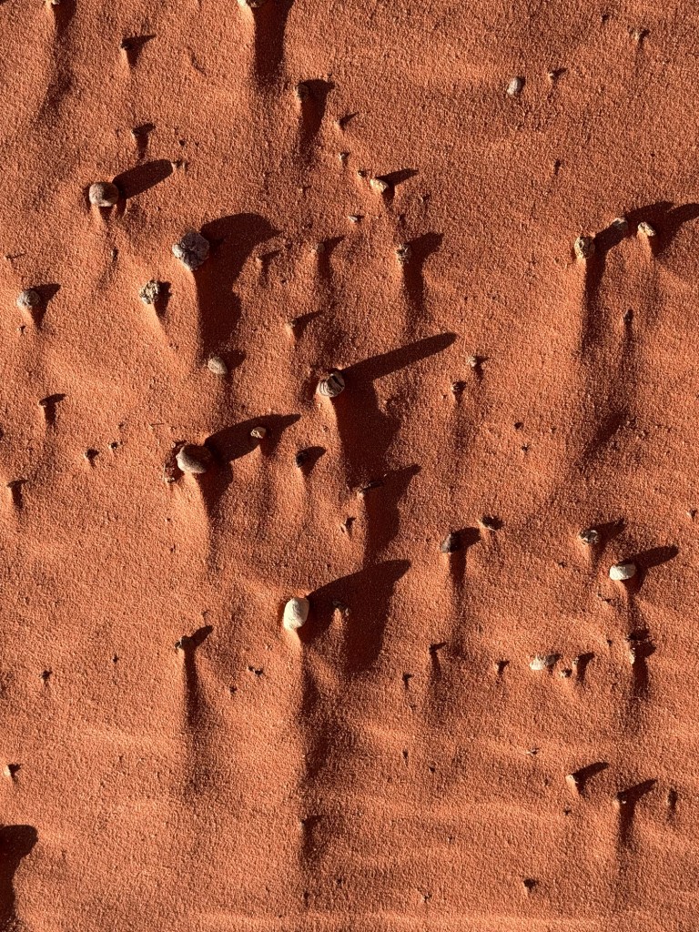 The area of the carvings had reddest of sand and beautiful, weathered rock. While watching where I was putting my feet, I noticed the beautiful shadows created by the setting sun.
