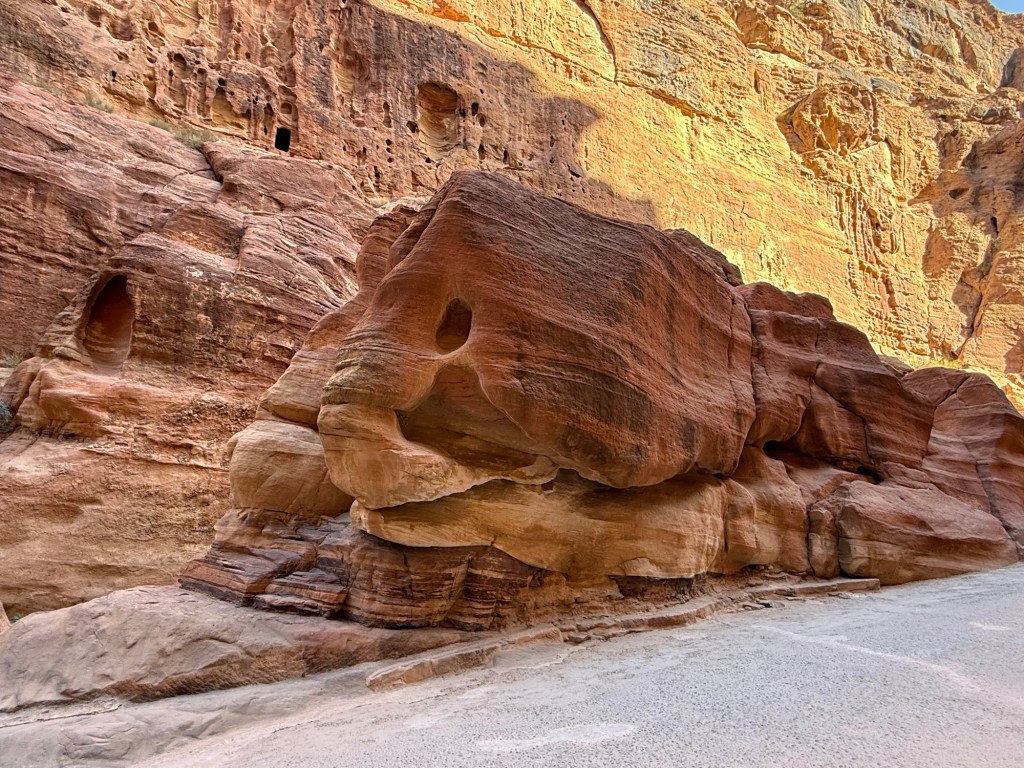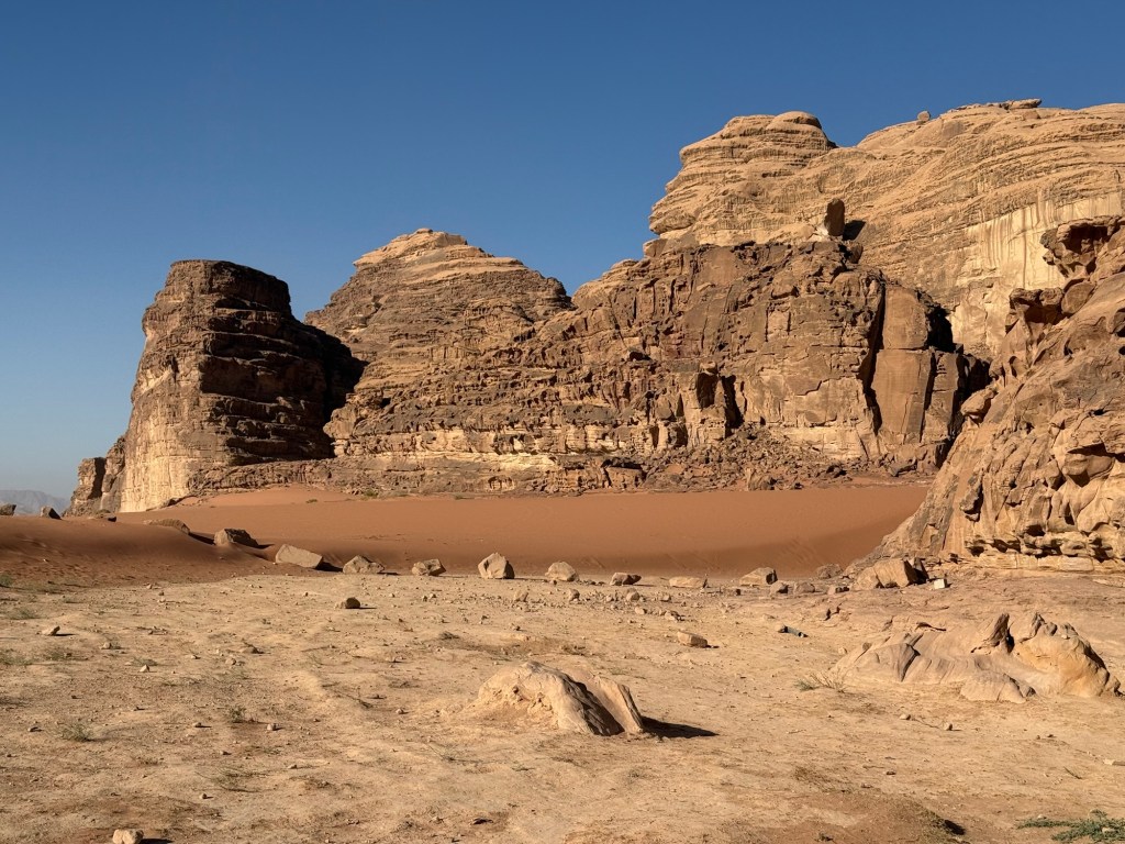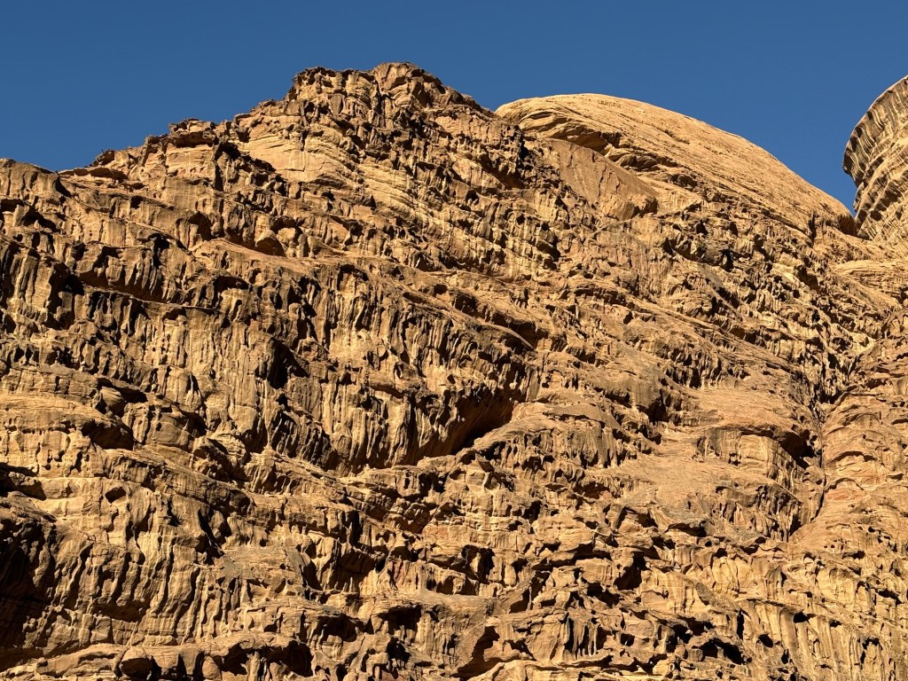 Rising out of the sand were fascinating rock formations, created by the same sedimentation – river carving processes as the gorges at Petra.