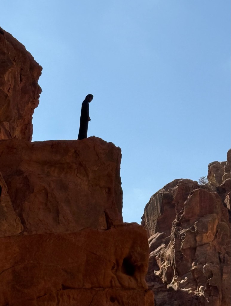 Looking up, I saw a silhouette of a man in Arabic attire. I climb up some rock steps to see what he was about, and gained a different perspective on the Treasury.