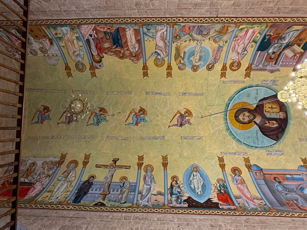Inside its main sanctuary, a wooden canopy supported by four pillars is placed above the altar, painted with biblical scenes, including Jesus Pantocrator and Archangel Gabriel appearing to Virgin Mary. The apse behind the altar is richly decorated with strips of marble and mosaics.