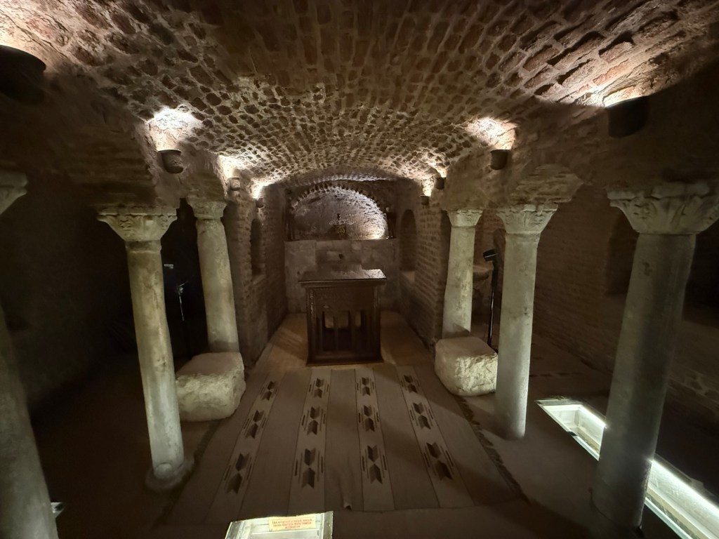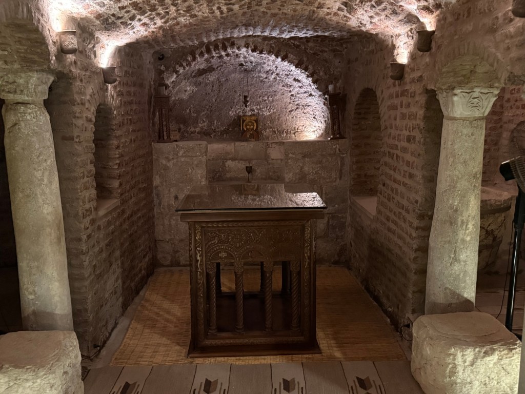 The church’s foundation consists of logs of palm trees and layers of stones built above the ruins of the Roman fortress.
